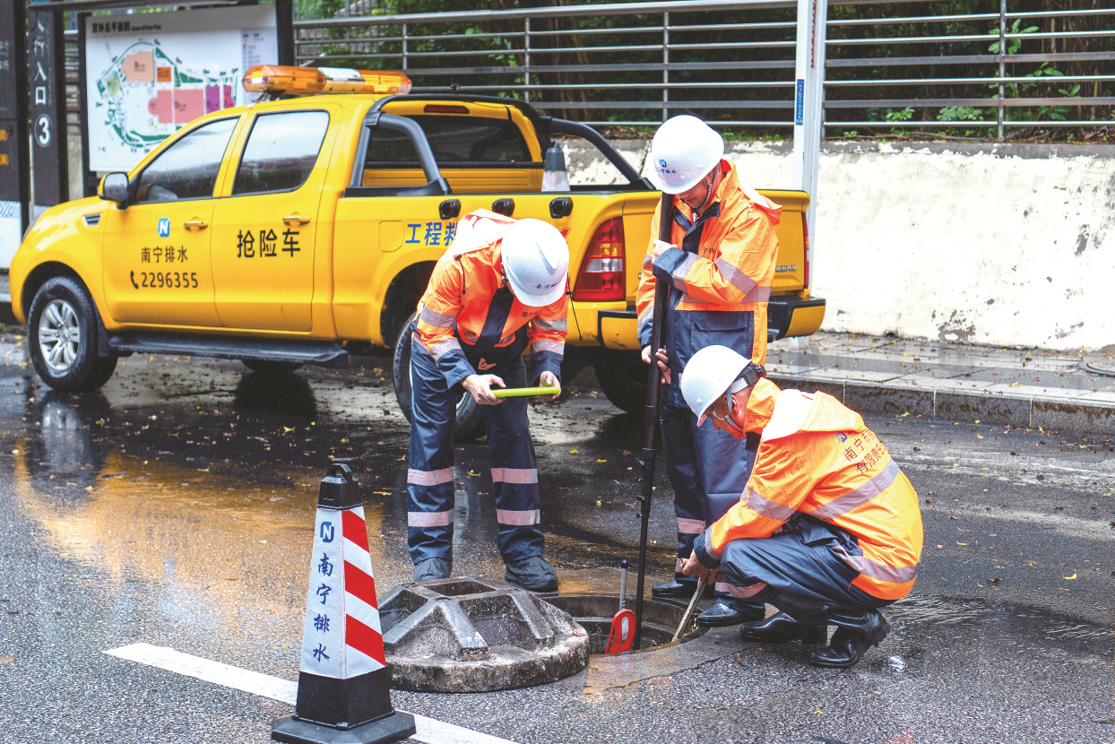 南寧市排水公司工作人員冒雨開(kāi)展作業(yè),保障重大活動(dòng)順利進(jìn)行。(梁榆峰 攝)