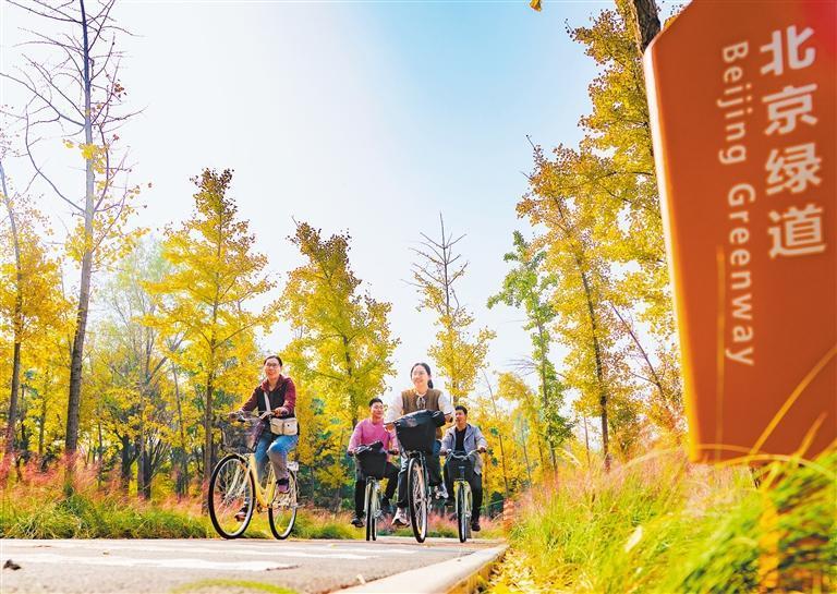 10月29日,市民在朝陽(yáng)區(qū)東壩公園北京綠道上騎行。朝陽(yáng)區(qū)利用濱水步道、通航河道將綠色空間相連成片,實(shí)現(xiàn)“一條綠道觀朝陽(yáng)”。