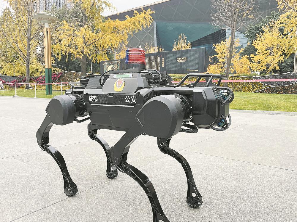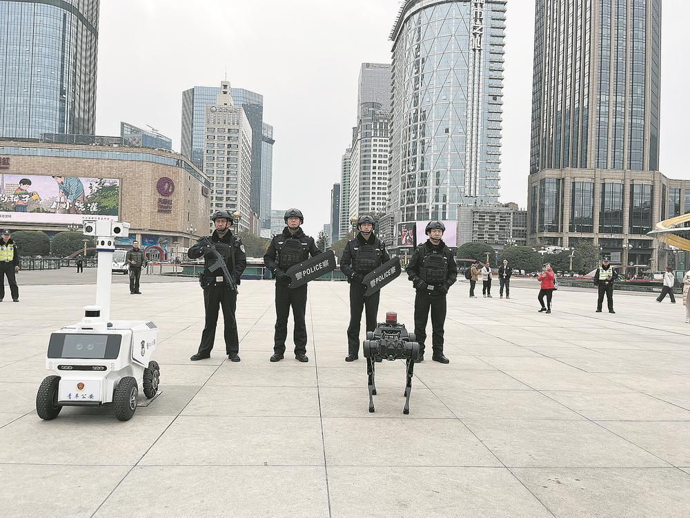 機(jī)器狗、智能巡防機(jī)器人參與天府廣場(chǎng)的治安巡邏