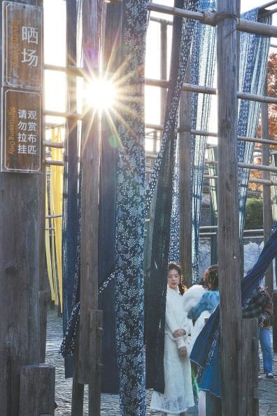 一匹匹高掛的藍印花布飛瀉而下,冬日暖陽中讓游客感受古鎮(zhèn)的溫暖。