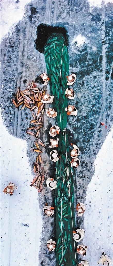 1月11日,新疆巴州博湖縣第十七屆冬雪季冬捕活動(dòng)在博斯騰湖大河口景區(qū)開幕,漁民正齊心協(xié)力拉網(wǎng)捕魚。謝江林 攝(中經(jīng)視覺)