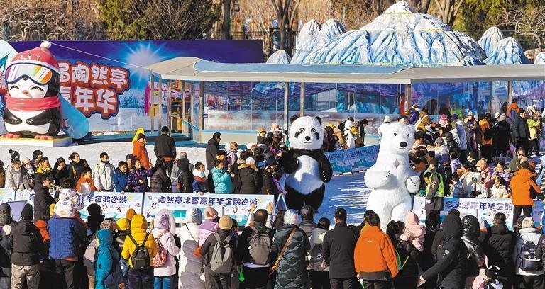 1月6日,北京第十五屆陶然亭冰雪嘉年華,游客在戲雪樂園參與人偶互動(dòng)表演。記者 劉月楊 攝