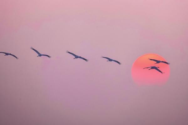 1月8日,臨湘市黃蓋湖,國(guó)家一級(jí)保護(hù)動(dòng)物白鶴穿日而過(guò)。白鶴全球數(shù)量6000多只,繁殖于西伯利亞,長(zhǎng)江中游是其最重要的越冬地。