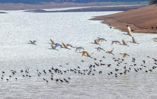 1月25日,岳陽(yáng)縣麻塘垸,國(guó)家二級(jí)保護(hù)動(dòng)物白琵鷺從一群鶴鷸上方翩然飛過(guò)。
