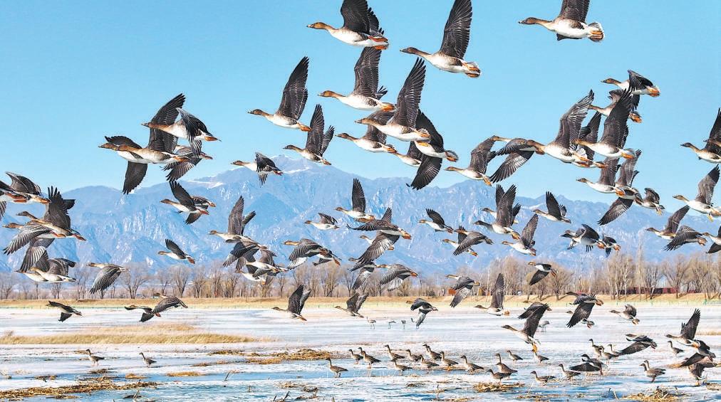 近日,延慶野鴨湖濕地自然保護(hù)區(qū)內(nèi),成群結(jié)隊(duì)的大雁從遠(yuǎn)方歸來(lái),在冬雪殘冰與藍(lán)天碧水交織的奇幻世界中翱翔、嬉戲,為這片靜謐的濕地帶來(lái)一抹初春的靈動(dòng)與生機(jī)。馬文曉 攝