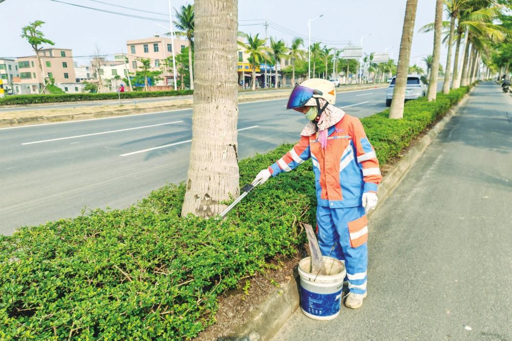 海口京美公司精細(xì)撿拾綠化帶中垃圾。王慧盈 攝