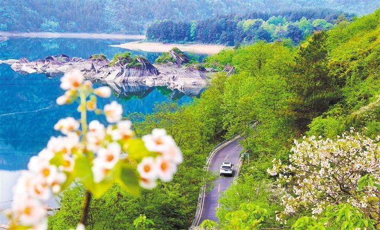 4月17日,車輛行駛在重慶市黔江區(qū)小南海鎮(zhèn)桐花掩映的繞湖公路上。楊敏攝(中經(jīng)視覺)