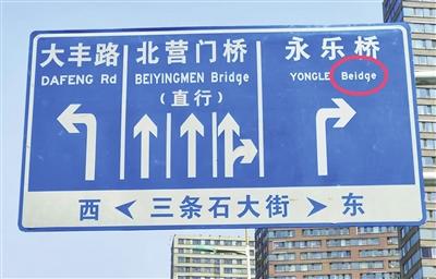英文拼寫(xiě)和翻譯的問(wèn)題在天津市一些道路指示牌上也屢見(jiàn)不鮮。河?xùn)|區(qū)八緯路與北十五經(jīng)路交口,一塊地面立桿式道路指示牌上,“大直沽西路”的英文“west(西)”錯(cuò)誤標(biāo)為“east(東)”;紅橋區(qū)河北大街永樂(lè)橋橋下的指示牌,將“Bridge(橋)”錯(cuò)拼成“Beidge”;紅橋區(qū)西沽公園門(mén)口的一塊指示牌,將“丁字沽南大街輔路”英文翻譯成“Dingzigu South Auxlllary Rd”,誤拼的“Auxlllary”讓人難以理解?!拔也孪?,可能是要用‘Auxiliary(輔助的)’這個(gè)單詞。”河北工業(yè)大學(xué)的一位學(xué)生說(shuō)。