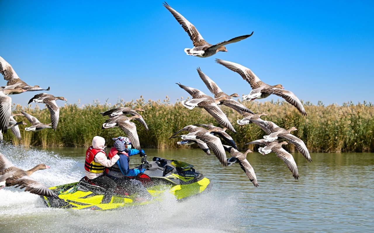 游客在沙湖景區(qū)乘坐快艇時大雁在一旁飛翔。當(dāng)日是國慶假期的第二天,許多游客來到寧夏石嘴山市沙湖景區(qū),感受沙漠與湖泊相依的獨特景觀。新華社記者 馮開華 攝