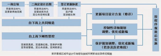 依據(jù)市級(jí)相關(guān)政策文件,結(jié)合項(xiàng)目實(shí)踐,南京秦淮區(qū)探索“自下而上多輪協(xié)商→自上而下規(guī)劃管控→修詳設(shè)計(jì)方案→控詳規(guī)劃優(yōu)化調(diào)整→初步設(shè)計(jì)→施工圖設(shè)計(jì)→建設(shè)實(shí)施→后續(xù)運(yùn)營(yíng)”聯(lián)動(dòng)管理機(jī)制??卦?、修詳規(guī)劃承接協(xié)商意見(jiàn)和管控要求,指導(dǎo)、支撐城市更新實(shí)踐。