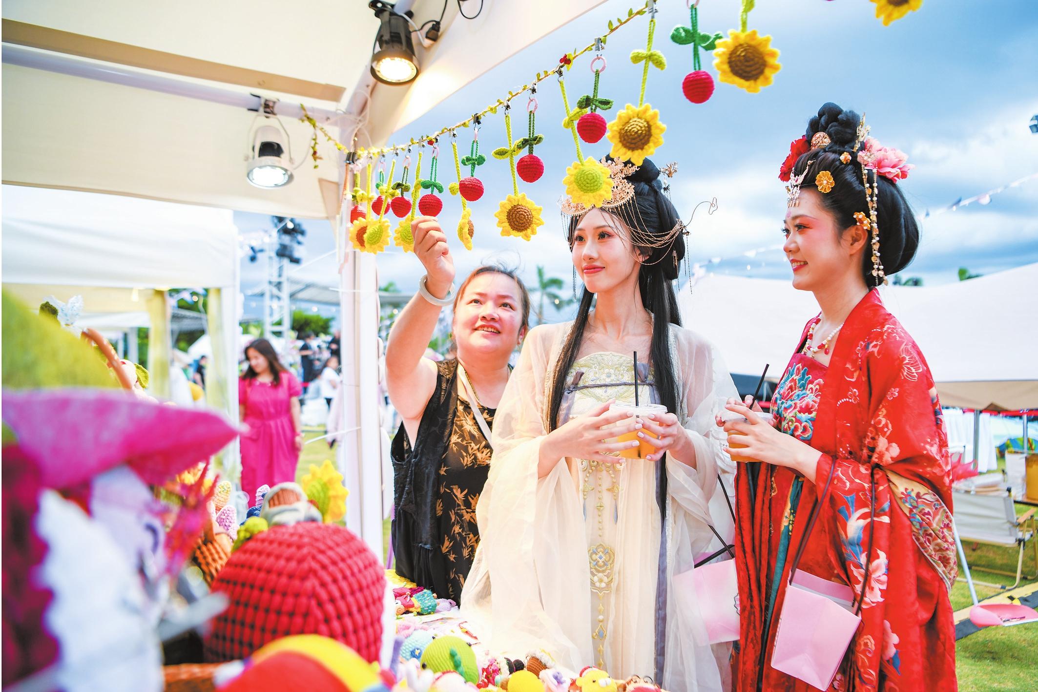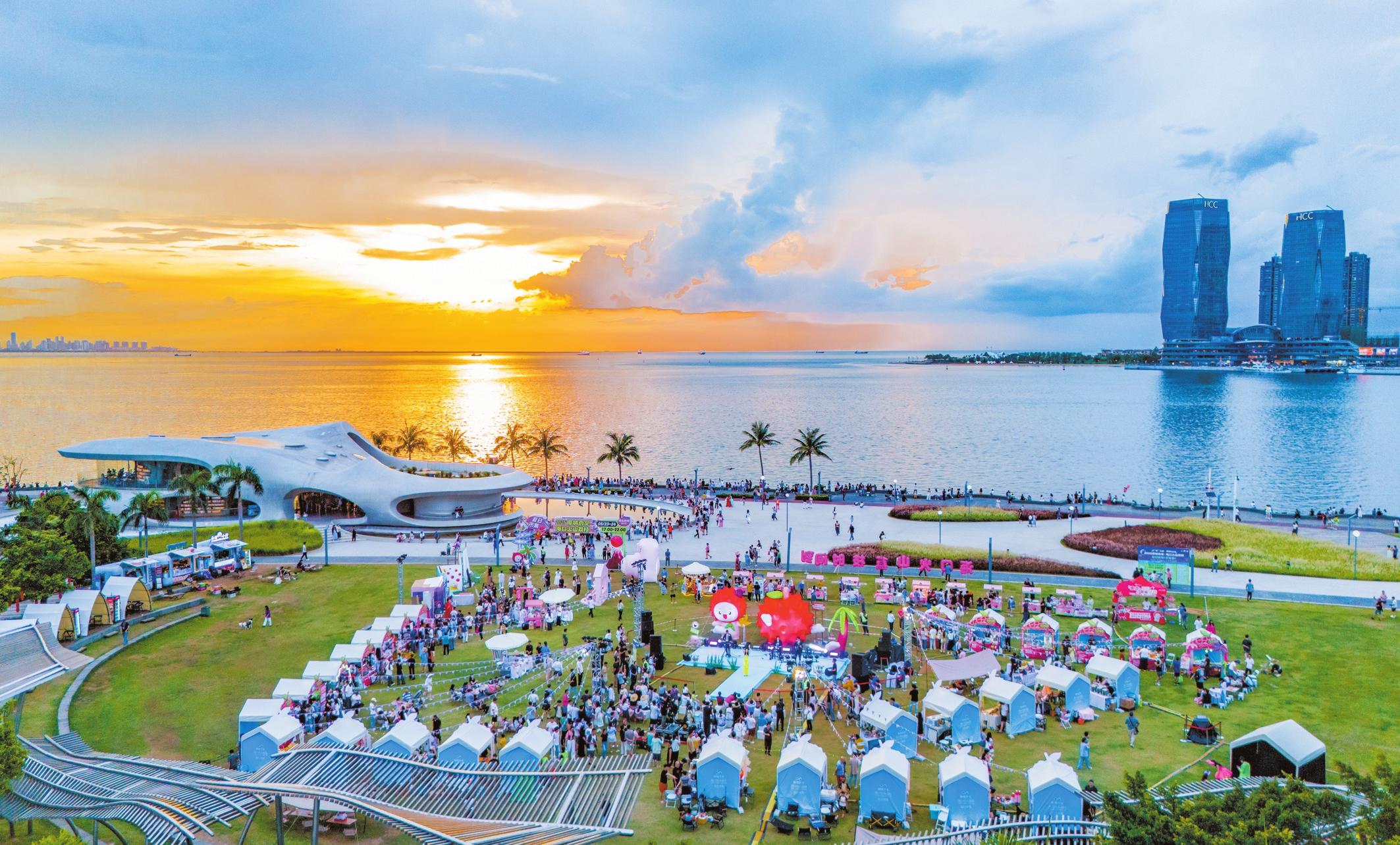 文化浸潤,以精神豐盈塑造城市品格。華燈初上,世紀海角文化商業(yè)街區(qū)的霓虹與晚霞交相輝映。手工藝人展示黎錦編織技藝,街頭樂隊奏響海南民歌,游客舉著“老爸茶”奶茶打卡拍照——這條2023年開業(yè)的特色街區(qū),已成為??谝菇?jīng)濟的“流量擔當”。