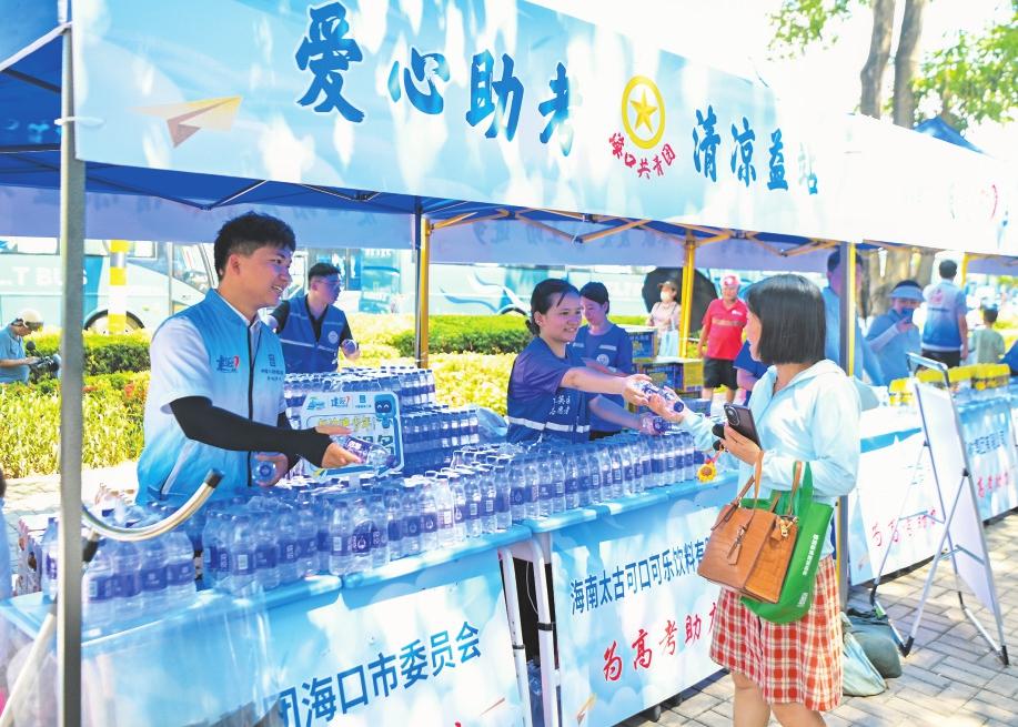 6月8日,在??诤8蹖W校考點外,青年志愿者為考生家長送上飲用水。記者 石中華攝