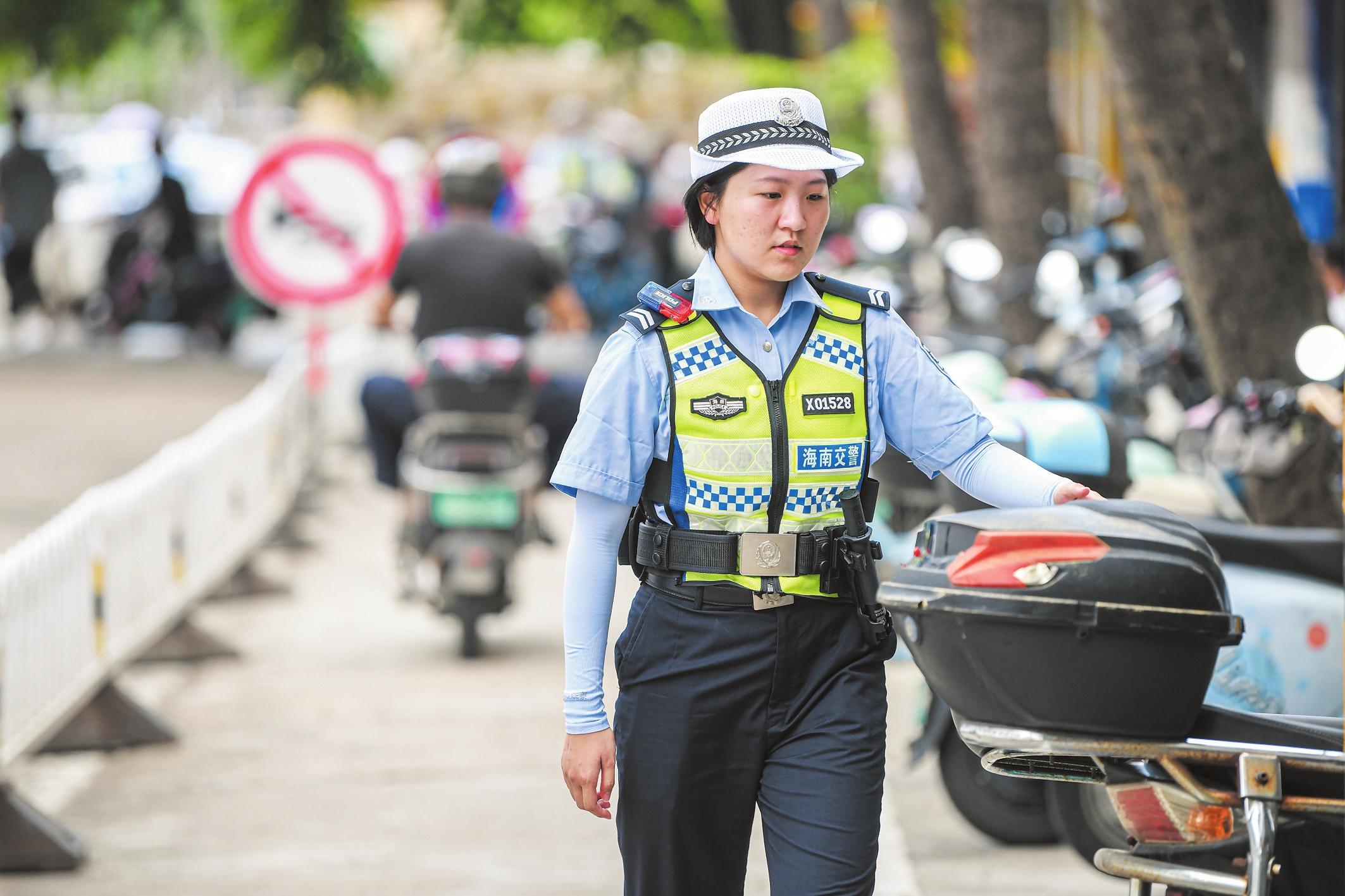 6月8日,在海南中學高中部考點,交警正在檢查考點附近的電動自行車警報,為英語考試營造安靜的環(huán)境。記者 蘇弼坤 攝