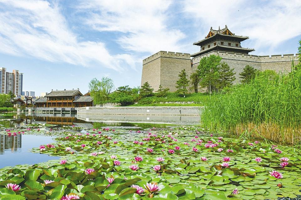 6月7日,在大同城墻帶狀公園東南角,護(hù)城河內(nèi)的大片睡蓮悄然盛開(kāi),與岸邊的綠樹(shù)、古城墻構(gòu)成一幅動(dòng)靜相宜的美麗畫(huà)卷。戎禹仁 攝