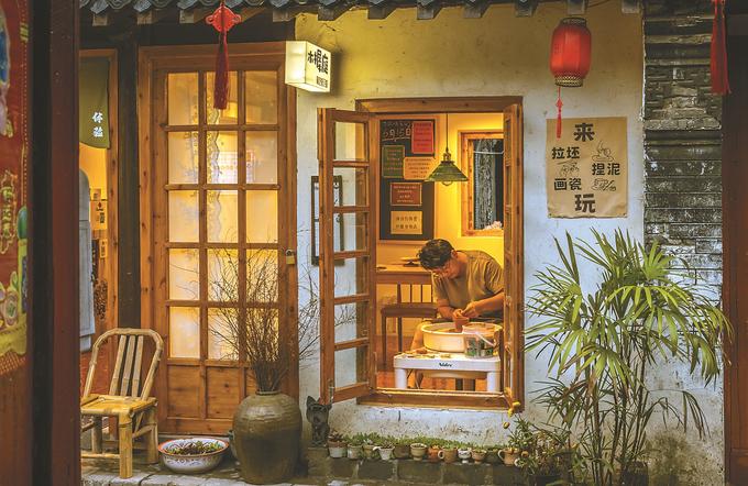 6月8日,南通寺街,90后鄒一鳴在自己的陶藝自習(xí)堂內(nèi)創(chuàng)作。創(chuàng)業(yè)一年多,小店名氣漸漲,還成了民盟南通市委的“科教文化交流基地”。龔衛(wèi)東 攝(視覺江蘇網(wǎng)供圖)