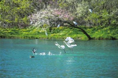 水質(zhì)澄澈,是河流的靈魂。曾幾何時(shí),汾河蒙塵。而今,清流滌蕩污濁,終于喚醒了沉睡的見(jiàn)證者——被譽(yù)為“活體水質(zhì)檢測(cè)器”的桃花水母,在四期水域輕盈旋舞,近乎透明的傘蓋如精靈般浮動(dòng)。清波之下,是萬(wàn)物生長(zhǎng)的秘境;碧水之上,是羽翼的樂(lè)園。天鵝、白鷺、蒼鷺、斑嘴鴨……上百種鳥兒于此棲息,它們翅膀的每一次扇動(dòng),都是對(duì)汾河生態(tài)最真實(shí)的肯定。騎行者在綠道上飛馳,身影融入兩岸的錦繡;游人漫步木棧道,步伐隱沒(méi)在流動(dòng)的詩(shī)意里;沿岸居民推窗見(jiàn)綠,汾河終于找回了它清亮的歌喉。
