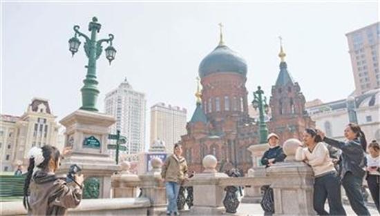 黑龍江省哈爾濱市,游客在索菲亞教堂附近游玩。哈爾濱市有“萬(wàn)國(guó)建筑博物館”的美譽(yù),當(dāng)?shù)赝诰驓v史底蘊(yùn),塑造城市發(fā)展新高度。新華社記者 謝劍飛攝