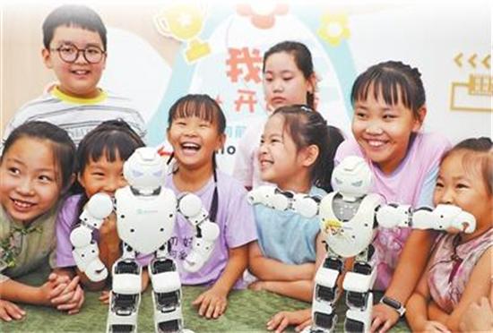 山東省東營(yíng)市東營(yíng)區(qū)辛店街道明珠社區(qū),小朋友學(xué)習(xí)機(jī)器人操作方法??破战逃M(jìn)社區(qū),進(jìn)一步提升居民科學(xué)素養(yǎng)。劉智峰攝(影像中國(guó))