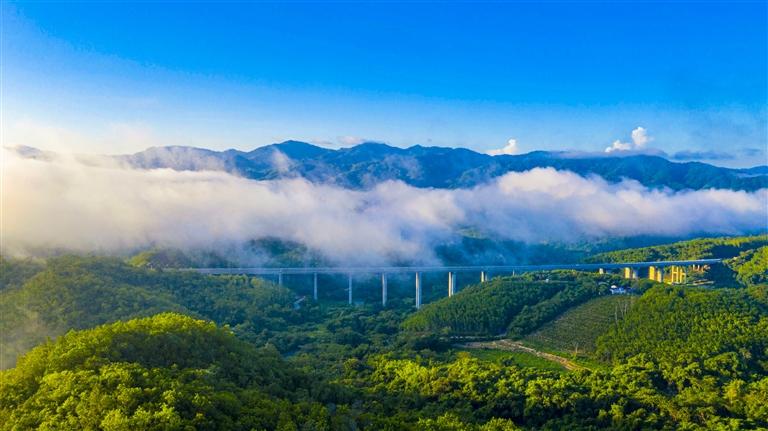 驅(qū)車行駛在瓊樂高速路上,宛如置身百里畫廊,路兩旁層巒疊翠,云霧與遠山相守相望,路、橋、隧道與樹林、田野、江水、湖泊等沿途景致和諧相融,渾然一體,堪稱“海南最美高速公路”。