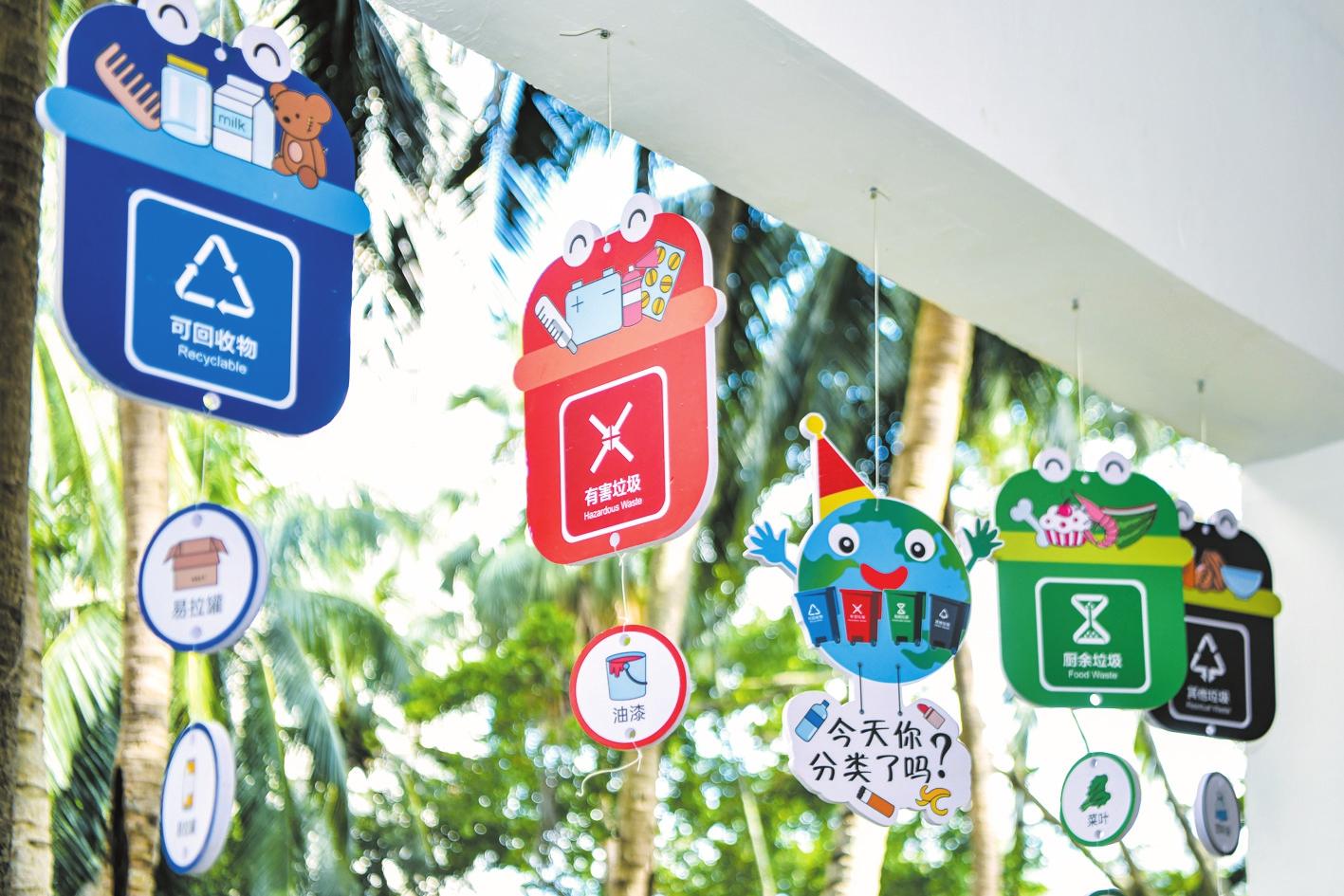 四季華庭小區(qū)在樓棟架空層打造垃圾分類宣教陣地,懸掛垃圾分類掛飾。記者 蘇弼坤 攝