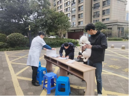行動(dòng)中,執(zhí)法隊(duì)在各社區(qū)的物業(yè)中心或公共活動(dòng)區(qū)域設(shè)立了“一站式”便民服務(wù)點(diǎn)。執(zhí)法人員、社區(qū)工作者及專業(yè)獸醫(yī)團(tuán)隊(duì)分工協(xié)作,現(xiàn)場(chǎng)秩序維護(hù)、信息核驗(yàn)、犬只免疫、芯片植入等環(huán)節(jié)銜接順暢。獸醫(yī)團(tuán)隊(duì)嚴(yán)格規(guī)范免疫與芯片植入流程,確保操作安全精準(zhǔn);執(zhí)法隊(duì)隊(duì)員現(xiàn)場(chǎng)解讀文明養(yǎng)犬法規(guī),解答居民疑問(wèn);社區(qū)工作人員同步完成犬主信息、犬只特征、免疫記錄及芯片編碼的“四維”信息采集,確保登記在冊(cè)的信息完整、準(zhǔn)確。