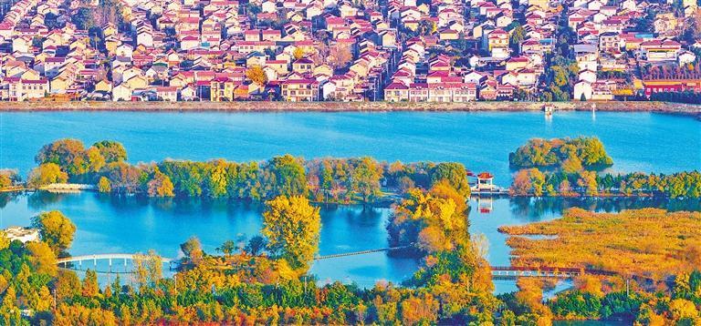 11月2日,深秋的安徽省淮北市烈山區(qū)烈山鎮(zhèn)榴園村層林盡染,金黃的石榴園與遠(yuǎn)處的村莊相映成景。張偉 攝(中經(jīng)視覺)