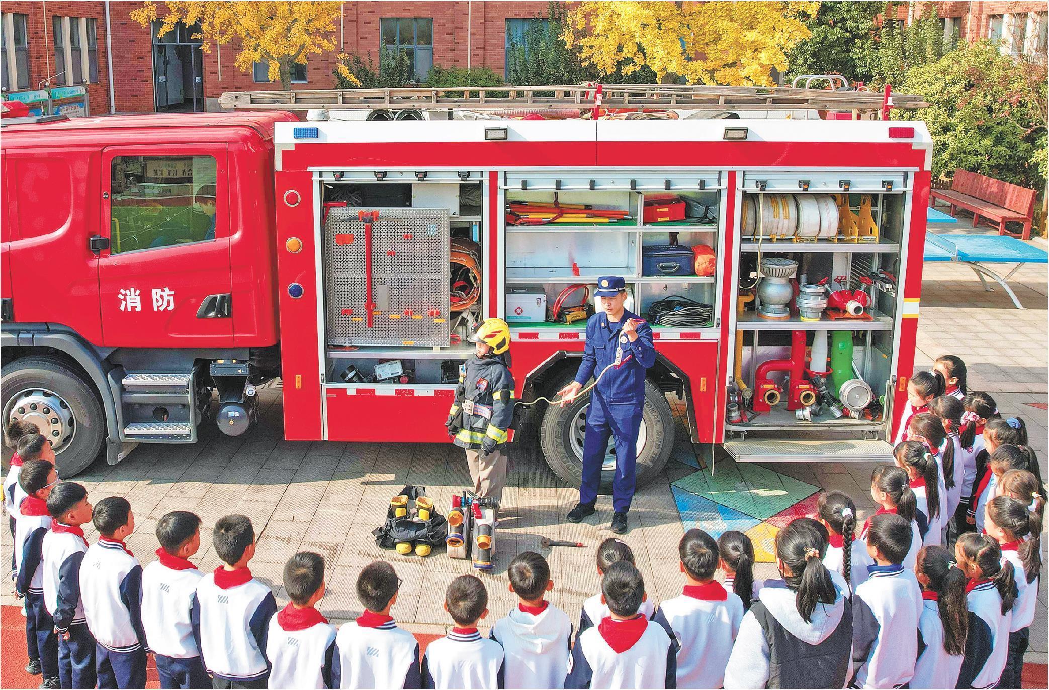 11月7日,消防救援人員為青島升平路小學(xué)學(xué)生講解消防裝備知識。