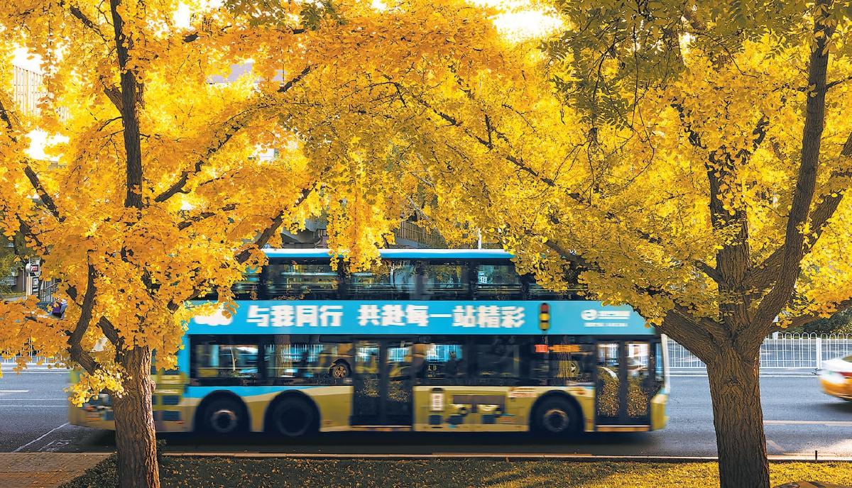 釣魚臺國賓館東墻外,一輛公交車在燦爛的銀杏樹下疾馳而過,奔赴每一站精彩。 王成鍵 攝