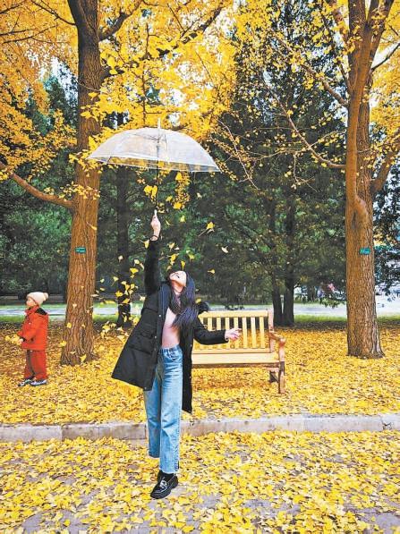 地壇公園,小雨中銀杏葉落,樹下女孩撐傘跳躍,留下溫馨浪漫的身影。劉凌 攝