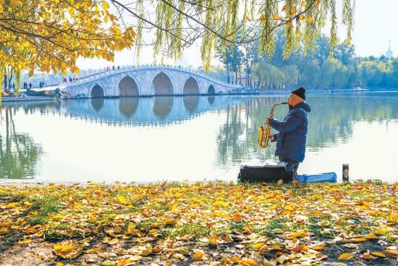 玉淵潭公園,老人獨(dú)自在湖畔吹奏著薩克斯,黃葉滿地,意韻閑適。史世超 攝