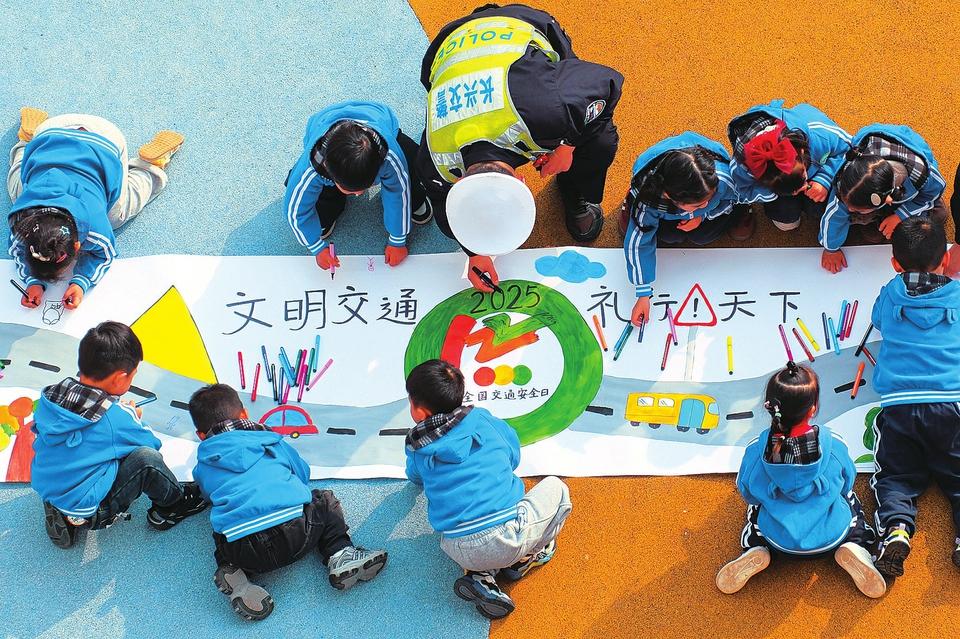12月1日,浙江省湖州市長興縣水口鄉(xiāng)中心幼兒園,長興縣公安局水口派出所交警中隊工作人員與小朋友一起繪制交通安全主題畫卷。在“全國交通安全日”來臨之際,各地開展交通安全進校園活動,為同學們普及交通安全知識,培養(yǎng)交通安全意識。新華社發(fā)(譚云俸 攝)