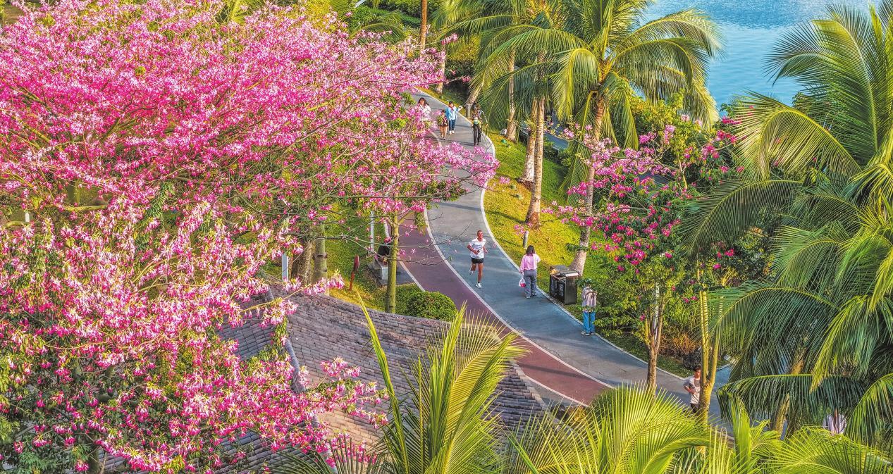 近日,海口紅城湖公園的異木棉進(jìn)入盛花期,滿枝花色絢麗,與椰林、湖岸相映成趣,為冬日添了一筆暖色,也為步道增添了浪漫氛圍。市民游客在其中或慢跑健身、或漫步賞花,一幅人與自然和諧相處的動(dòng)人畫卷在椰城鋪開。(記者 康登淋 攝)