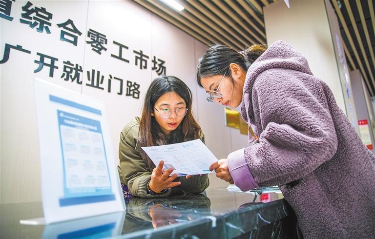 2月27日,浙江省湖州市德清縣阜溪街道綜合零工市場大廳,工作人員向求職者介紹靈活就業(yè)相關信息。王樹成攝(中經視覺)