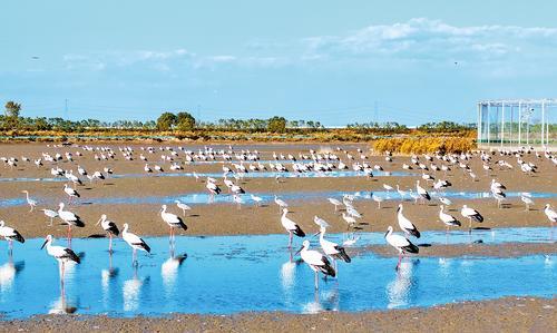 2025年11月4日,曹妃甸濕地和鳥類省級自然保護區(qū),成群的東方白鸛在覓食。河北日報記者 趙 杰攝