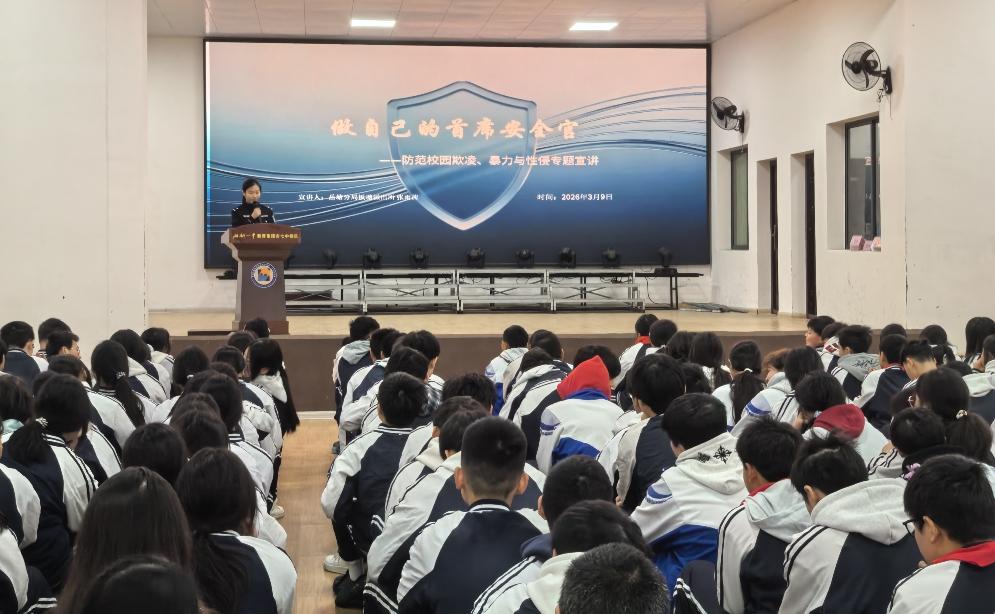 為進一步筑牢校園安全防線,切實增強未成年人法治意識和自我保護能力,3月9日,湖南省湘潭市湘鋼一中教育集團七中校區(qū)邀請湘潭市公安局岳塘分局板塘派出所民警張雨茜進校園,開展以“做自己的首席安全官”為主題的法治安全宣講活動?;顒泳劢狗婪缎@欺凌、暴力侵害及性侵害等重點內(nèi)容,從源頭上預(yù)防和減少侵害未成年人案件發(fā)生。