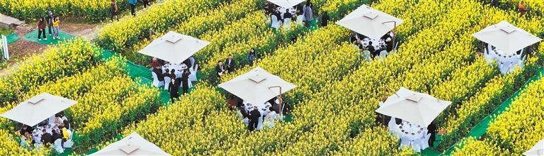 3月13日,游客在四川省南充市蓬安縣睦壩鎮(zhèn)武勝村油菜花田品嘗“花田席”。劉永紅 攝(中經(jīng)視覺)