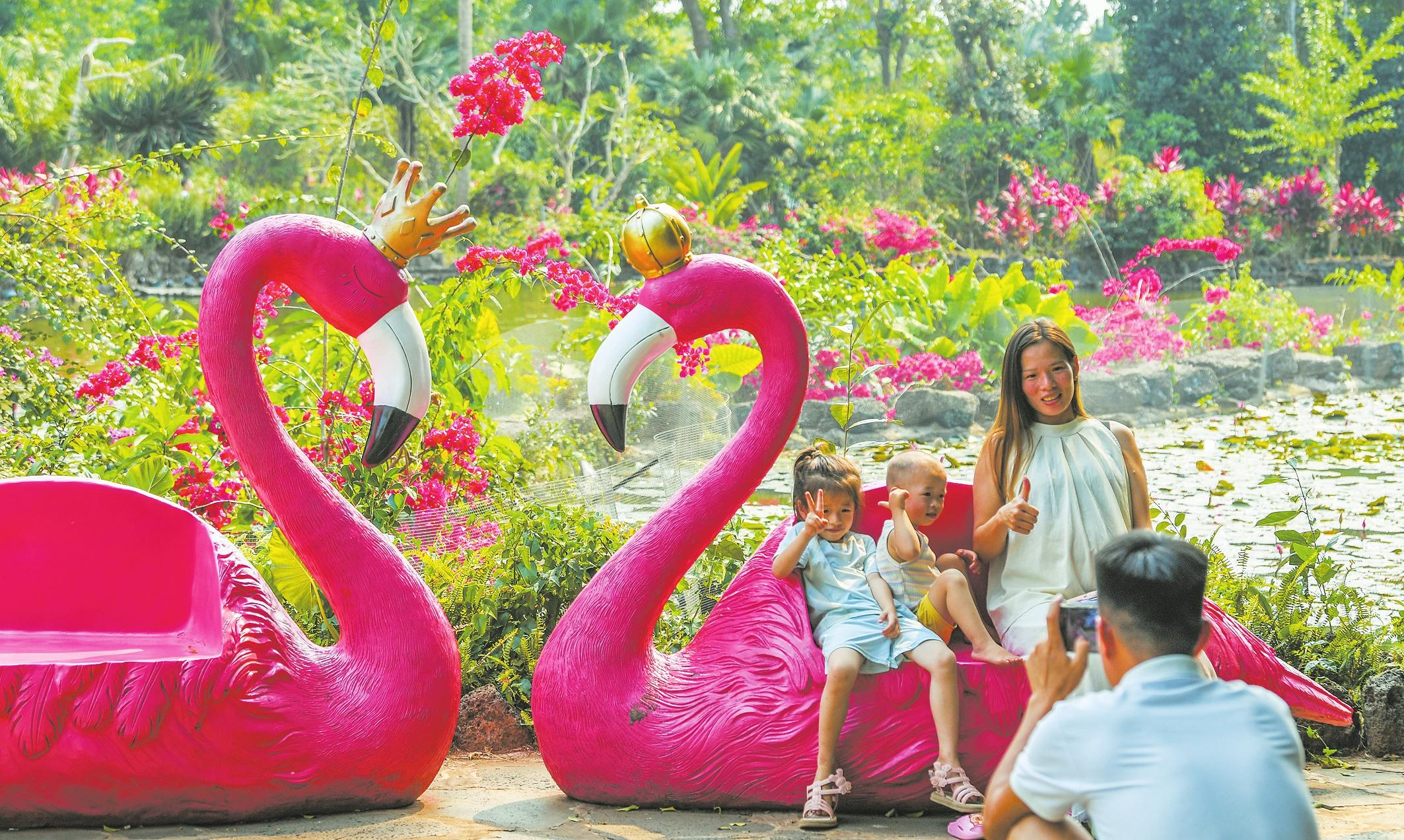 親子家庭在海南熱帶野生動(dòng)植物園內(nèi)打卡拍照。記者 康登淋 攝