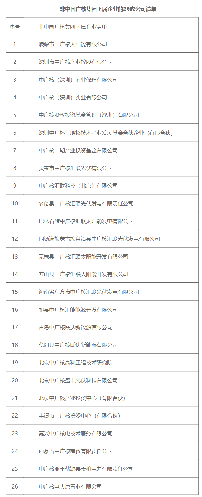 4月份,中廣核發(fā)布公告稱:凌源市中廣核太陽能有限公司、深圳市中廣核產(chǎn)業(yè)控股有限公司、嘉興中廣核電技術(shù)服務(wù)有限公司等26家公司在企業(yè)名稱中使用“中廣核”字樣。鑒于該26家公司并非我集團下屬企業(yè),鄭重澄清并嚴正聲明,中國廣核集團未擁有下述26家公司的任何資產(chǎn)或股權(quán),亦無隸屬或管理關(guān)系,并未授權(quán)下述公司使用“中廣核”商標和字號,若因下述公司的經(jīng)營行為導致法律、勞務(wù)糾紛或其他相關(guān)責任,均與我集團無關(guān)。
