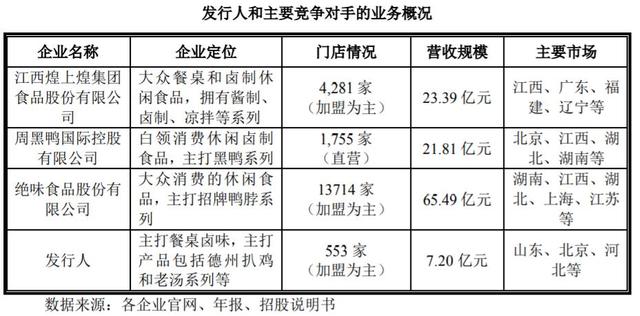 在招股書中,德州扒雞將休閑鹵制品企業(yè)煌上煌、周黑鴨、絕味食品列為行業(yè)內主要競爭對手。需要注意的是,不論是營收規(guī)模還是門店數(shù)量,德州扒雞都遠不及這些競爭對手。