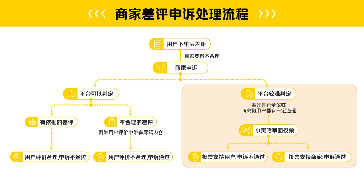 為了保障用戶合理評價權益、避免商家遭受不合理差評的影響,美團外賣升級迭代產(chǎn)品功能,引入公眾評審機制——小美陪審團。用戶和商家之間如果出現(xiàn)爭議差評,且雙方難以主動達成和解時,熱心的社會公眾、用戶和商家都可以報名作為評審員,根據(jù)用戶和商家雙方提供的材料判斷,并對爭議差評進行投票判定。