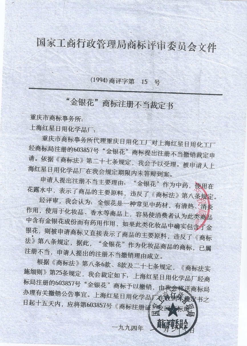 申請人詩妍公司向法庭展示了(1994)商評字第15號“金銀花”商標(biāo)注冊不當(dāng)裁定書。這份裁定書載明,重慶日用化工廠對上海紅星日用化工廠(金銀花商標(biāo)的注冊人)提出了商標(biāo)注冊不當(dāng)撤銷申請,當(dāng)時(shí)的國家工商行政管理局商標(biāo)評審委員會(huì)作出裁定:對該商標(biāo)予以撤銷。