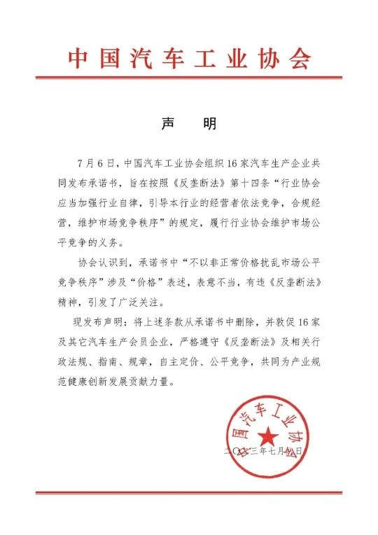 中國(guó)汽車工業(yè)協(xié)會(huì)表示,現(xiàn)發(fā)布聲明:將上述條款從承諾書中刪除,并敦促16家及其它汽車生產(chǎn)會(huì)員企業(yè),嚴(yán)格遵守《反壟斷法》及相關(guān)行政法規(guī)、指南、規(guī)章,自主定價(jià)、公平競(jìng)爭(zhēng),共同為產(chǎn)業(yè)規(guī)范健康創(chuàng)新發(fā)展貢獻(xiàn)力量。