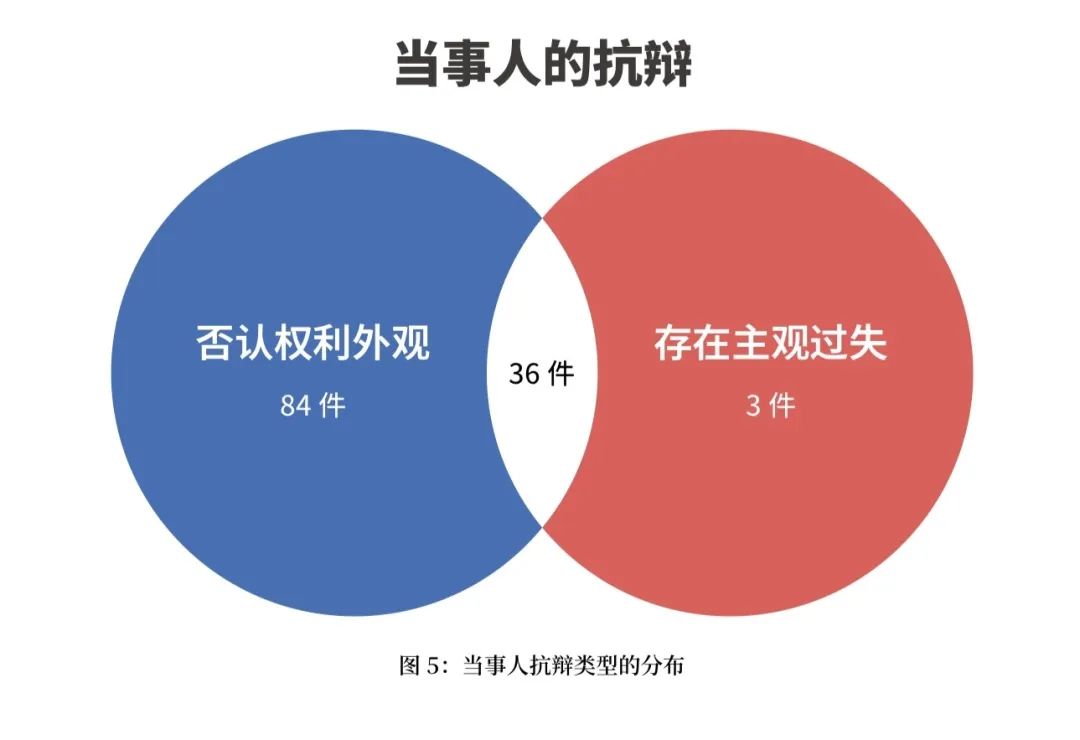 123件涉表見代理商事合同糾紛案件中,有84件抗辯否認(rèn)權(quán)利外觀存在,有3件抗辯相對人主觀上存在過失,有36件抗辯既否認(rèn)權(quán)利外觀存在,又認(rèn)為相對人主觀上存在過失。(如圖5)