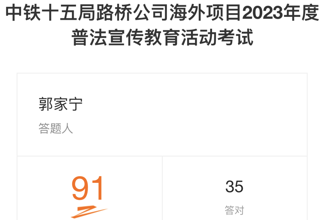 活動期間,公司境外項目開展線上法律知識測試活動,試卷內(nèi)容涉及憲法、民法 、安全生產(chǎn)法等法律法規(guī)知識,深入貼合職工生活和工作實際,針對性強(qiáng)。通過以考促學(xué)、以考促用,為建設(shè)法治路橋、平安路橋提供堅強(qiáng)有力保障。