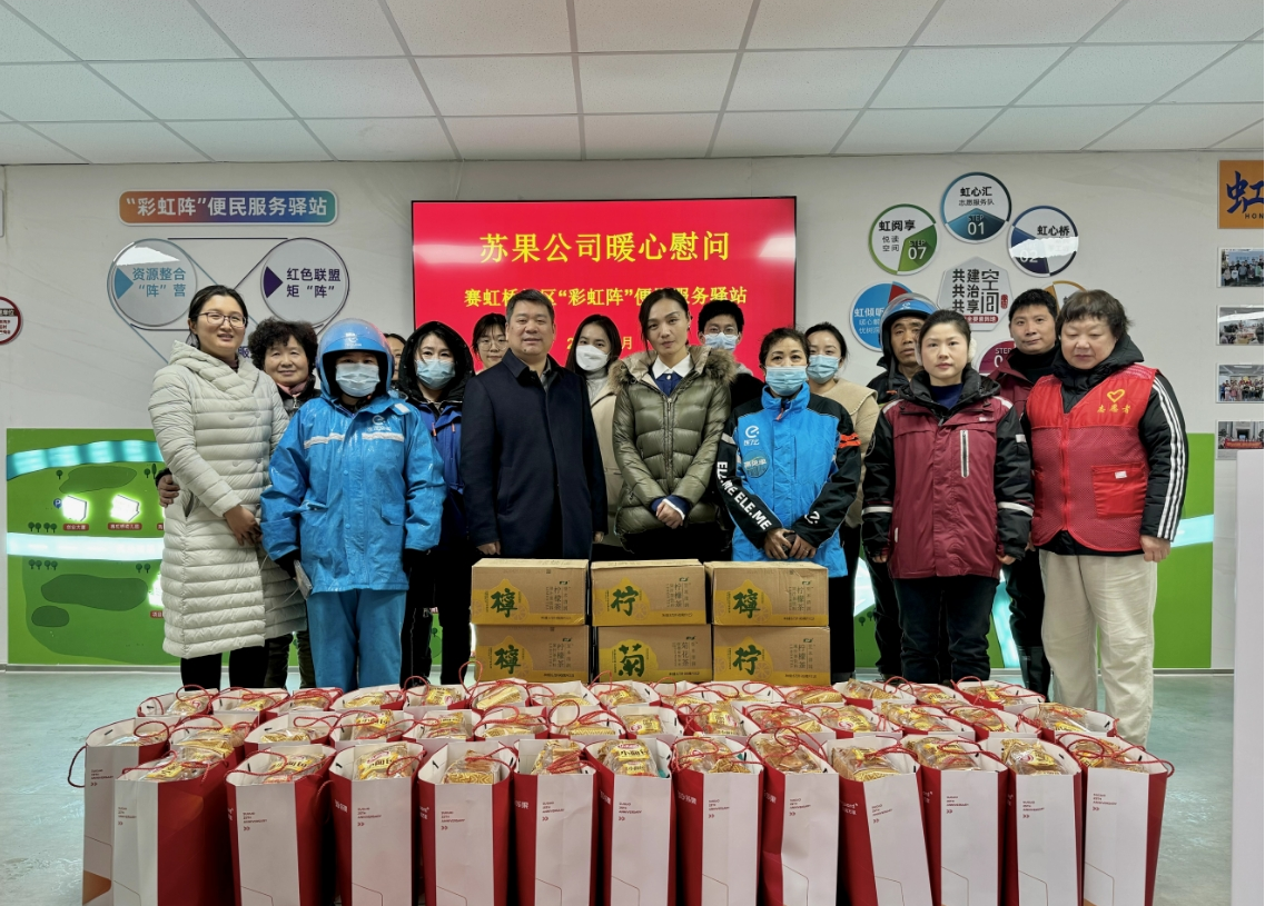 1月18日上午,寒風凜冽,蘇果愛心志愿者團隊來到南京市雨花臺區(qū)賽虹橋社區(qū)“彩虹陣”便民服務(wù)驛站,為社區(qū)內(nèi)的外賣員、快遞員、環(huán)衛(wèi)工人等冬季戶外工作者送來保溫桶、姜糖茶、面包、麥片、飲料等關(guān)愛物資,向他們表示關(guān)懷與敬意?!昂芨袆?,也很感謝來自蘇果的關(guān)愛,天氣雖冷,但是我們的心確是暖暖的。”蘇果的善意之舉,令戶外工作者們感受到濃濃的暖意。