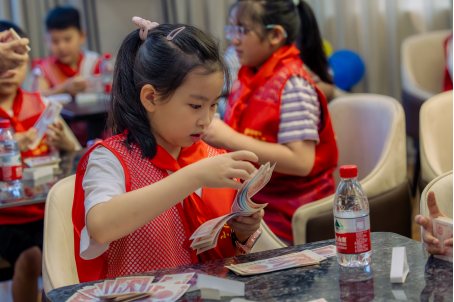 在“點(diǎn)鈔大PK”環(huán)節(jié),支行員工向同學(xué)們展示了不同的專業(yè)點(diǎn)鈔手法,并手把手地教授規(guī)范的點(diǎn)鈔動(dòng)作。孩子們摩拳擦掌、躍躍欲試。隨著一聲令下“開始”,孩子們很快進(jìn)入了狀態(tài),緊張的呼吸聲伴隨著練功券翻動(dòng)的聲音,此刻他們仿佛真的成為了“小小銀行家”。