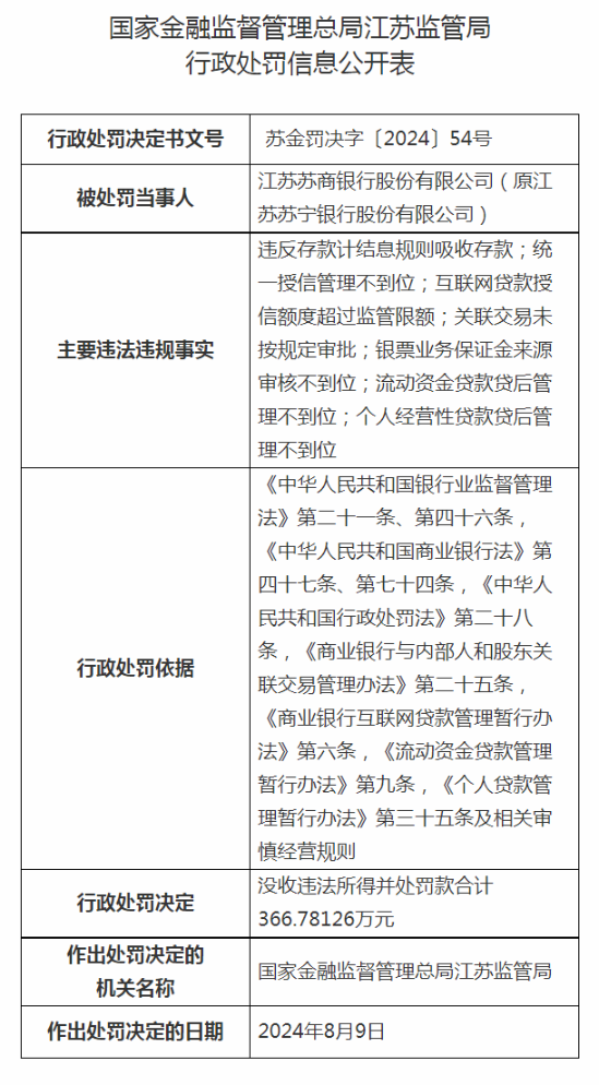 針對(duì)上述違法違規(guī)行為,國(guó)家金融監(jiān)督管理總局江蘇監(jiān)管局依據(jù)《中華人民共和國(guó)銀行業(yè)監(jiān)督管理法》第二十一條、第四十六條,《中華人民共和國(guó)商業(yè)銀行法》第四十七條、第七十四條,《中華人民共和國(guó)行政處罰法》第二十八條,《商業(yè)銀行與內(nèi)部人和股東關(guān)聯(lián)交易管理辦法》第二十五條,《商業(yè)銀行互聯(lián)網(wǎng)貸款管理暫行辦法》第六條,《流動(dòng)資金貸款管理暫行辦法》第九條,《個(gè)人貸款管理暫行辦法》第三十五條及相關(guān)審慎經(jīng)營(yíng)規(guī)則,對(duì)蘇商銀行沒收違法所得并處罰款合計(jì)366.78126萬元。作出行政處罰決定日期為2024年8月9日。