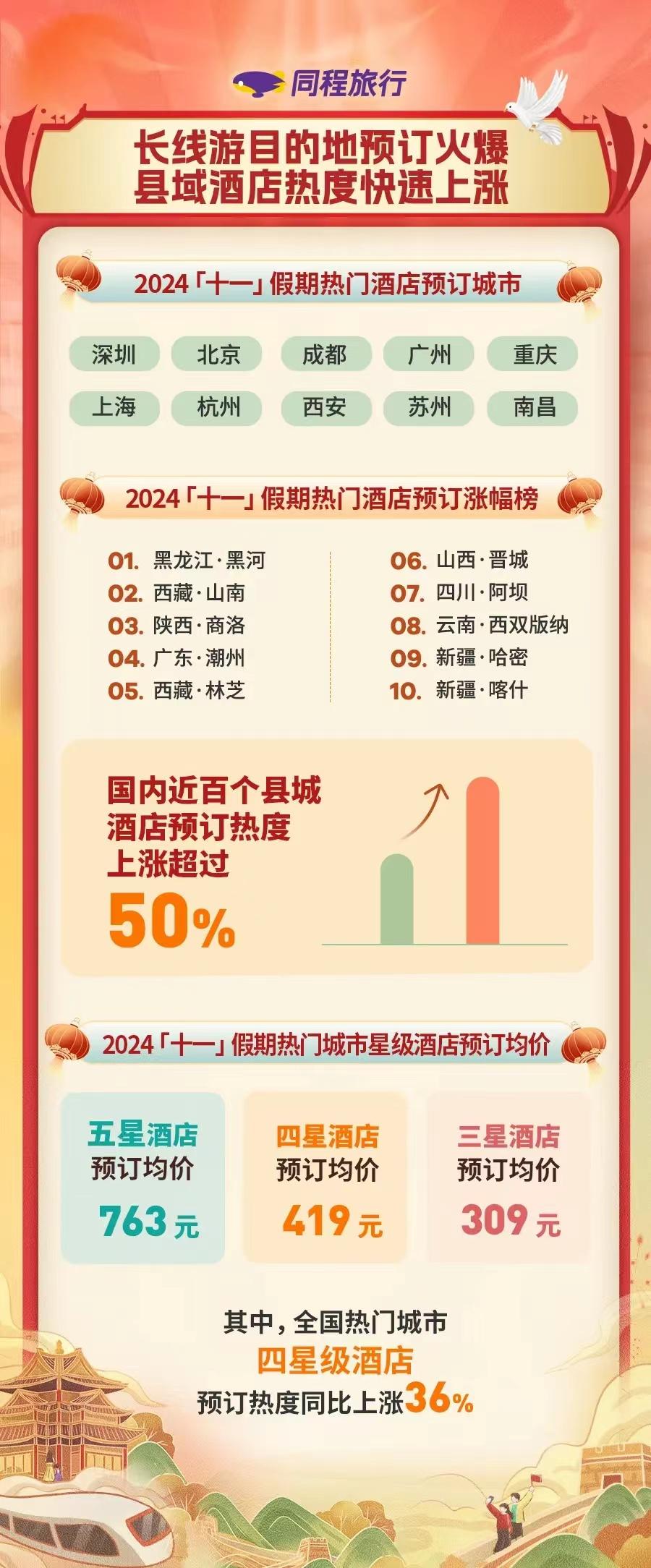 同程旅行數(shù)據(jù)顯示,2024年“十一”假期國內(nèi)各大熱門縣域目的地酒店預(yù)訂增速超過大盤。其中,預(yù)訂熱度同比漲幅超過50%的縣和縣級市就有近百個。
