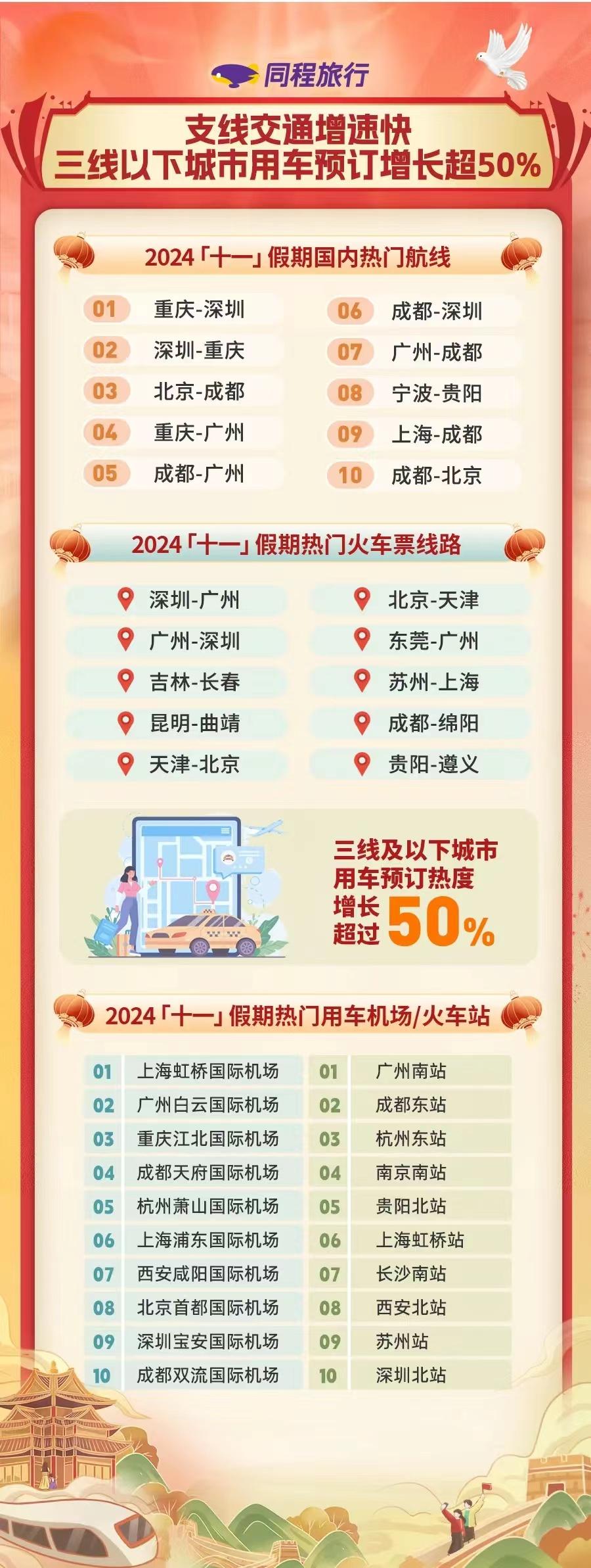 10月7日,同程旅行發(fā)布的《2024“十一”假期旅行消費(fèi)報告》顯示,2024年“十一”假期,國內(nèi)旅行消費(fèi)市場持續(xù)增長,二三線及以下城市居民出游消費(fèi)增長迅速。同程旅行平臺上,三線及以下城市用車預(yù)訂熱度增長超過50%;縣城文旅成假期消費(fèi)亮點,全國近百個縣城酒店預(yù)訂熱度同比上漲超過50%。