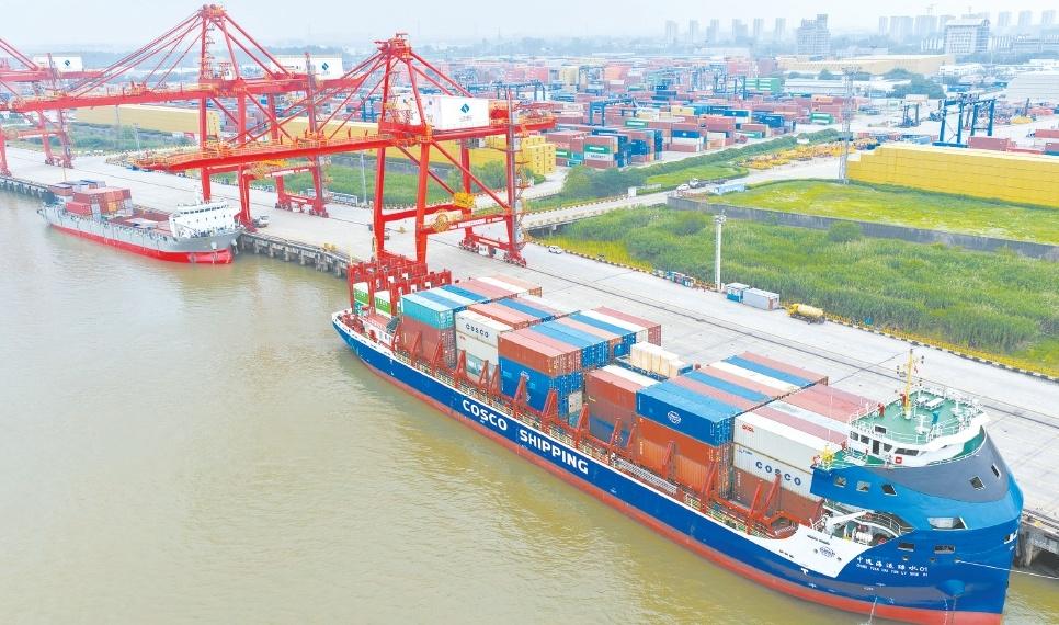 海關(guān)總署9日發(fā)布數(shù)據(jù)顯示,今年前5個月我國貨物貿(mào)易進出口同比增長2.5%。圖為9日當天的南京港龍?zhí)陡蹍^(qū)。(視覺中國)